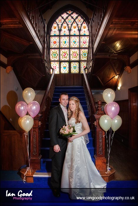 After a lovely emotional ceremony and a few photos outside the church, the bride and groom were driven to the reception in a vintage Riley. The Kings Court Masonic Centre has very pretty gardens and a picturesque staircase inside, with a stained glass window at the top, making it ideal for wedding photography.