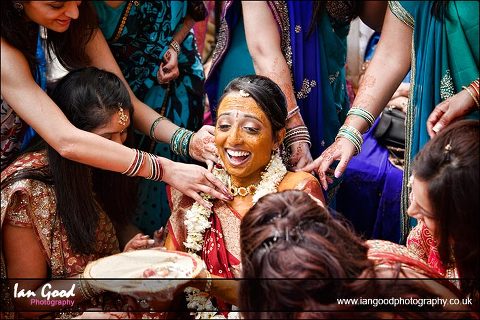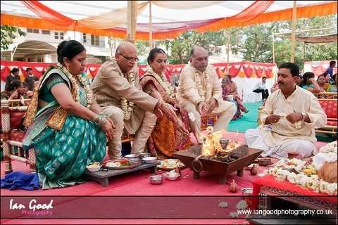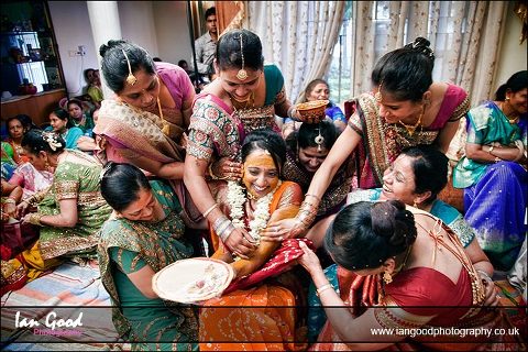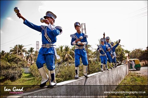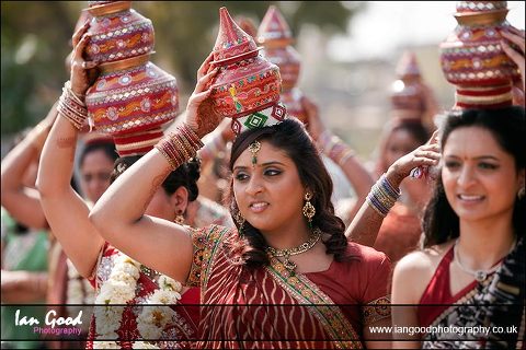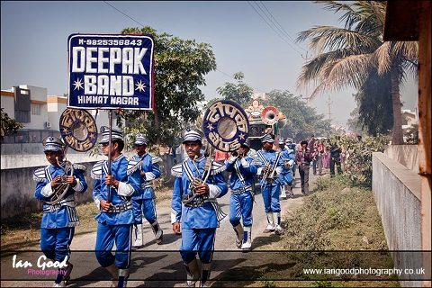 The morning of the wedding day started at the bridal house for Tanvi’s Vidhi. The ceremonies started with Ganesh Sthapan and Mandap Ropan, before the Pithi, where the bride’s skin is covered with a turmeric paste. Outside the house, the bride’s parents, uncle and aunt performed the Grah Shanti. The morning events ended with the Varadh, where the ladies carried pots through the streets from the nearby temple, accompanied by the band and a few firecrackers! With the sun getting quite hot by lunchtime, this certainly made quite a change from some of my recent weddings in the snow!